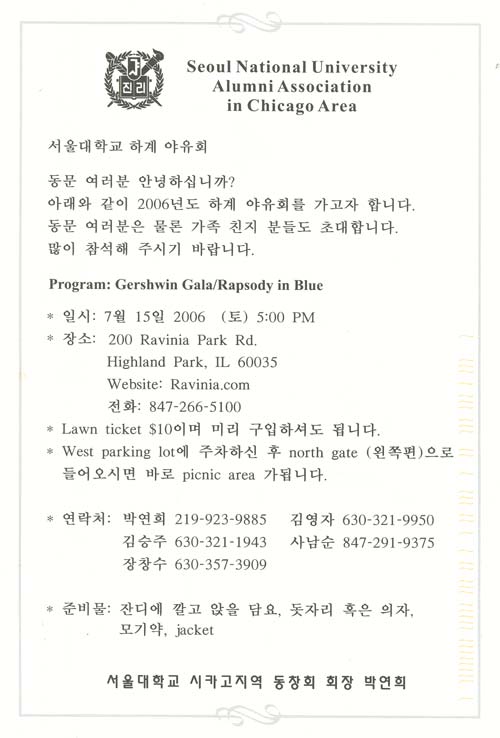 SNUAA Chicago 2006 Picnic at Ravinia Park - July 15 (Saturday) |