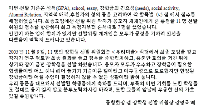 아래 장학생들은 각각 $1,000 장학금을 수여받았습니다.